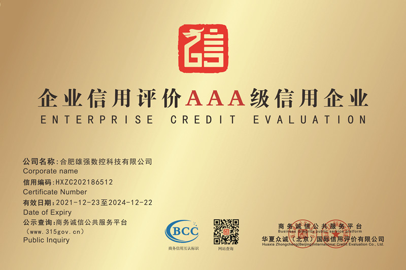 2021年12月,經第三方權威征信機構的審核,合肥雄強數控科技有限公司獲得“AAA級企業信用等級”證書及信用等級牌匾。“AAA企業信用等級證書”代表了企業信用評定的最高級別,此次在企業信用等級評價中獲得AAA認證,是對合肥雄強數控科技有限公司實力和信譽的高度認可,是公司在健康發展過程中獲得的又一重要里程碑,這一資質對企業后續發展具有深遠的意義。